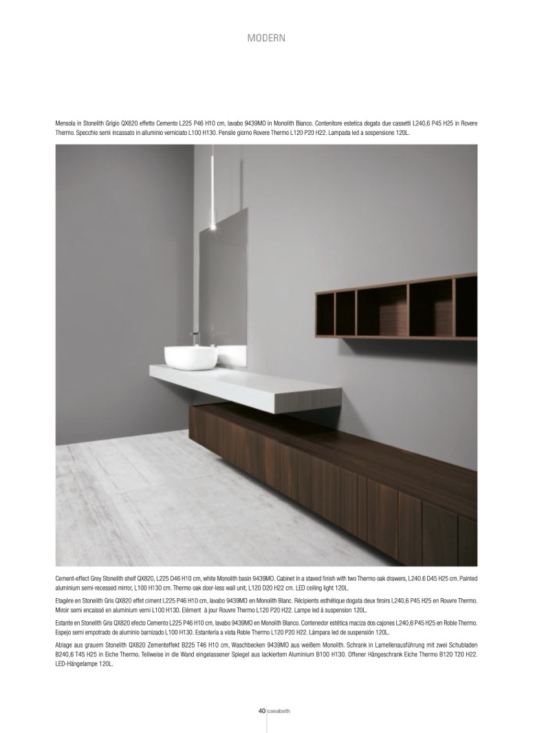 Etagère en Stonelith Gris QX820 effet ciment L225 P46 H10 cm, lavabo 9439MO en Monolith Blanc. Récipients esthétique dogata deux tiroirs L240,6 P45 H25 en Rouvre Thermo.