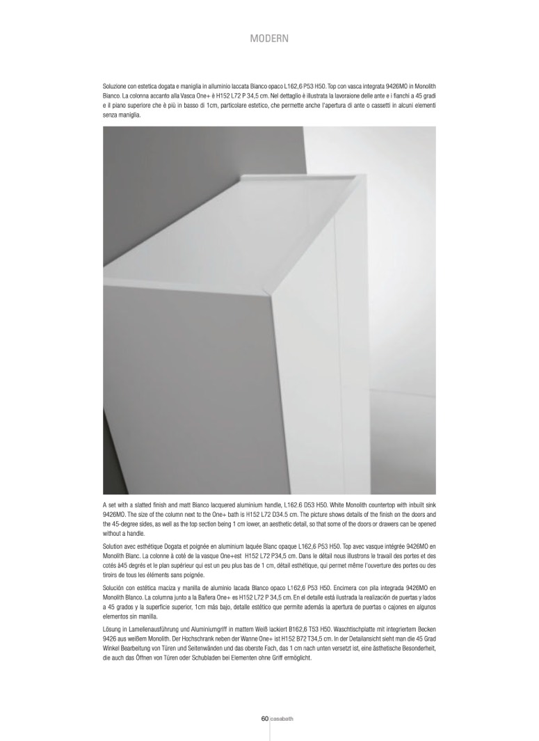 9426 aus weißem Monolith. Der Hochschrank neben der Wanne One+ ist H152 B72 T34,5 cm. In der Detailansicht sieht man die 45 Grad