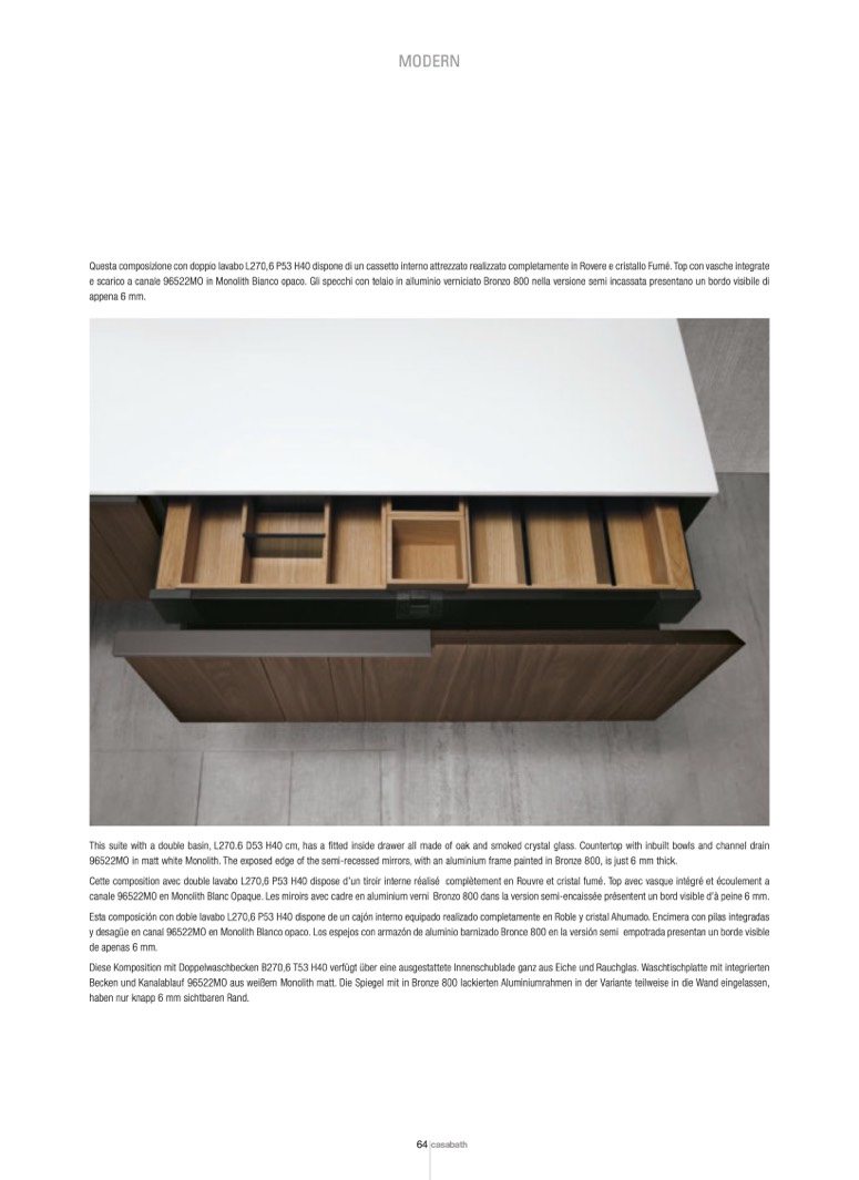 Questa composizione con doppio lavabo L270,6 P53 H40 dispone di un cassetto interno attrezzato realizzato completamente in Rovere e cristallo Fumé. Top con vasche integrate