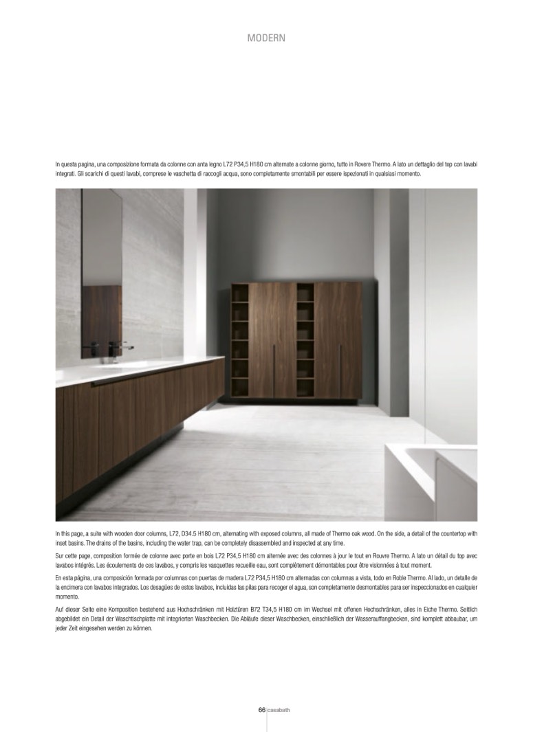 In this page, a suite with wooden door columns, L72, D34.5 H180 cm, alternating with exposed columns, all made of Thermo oak wood. On the side, a detail of the countertop with