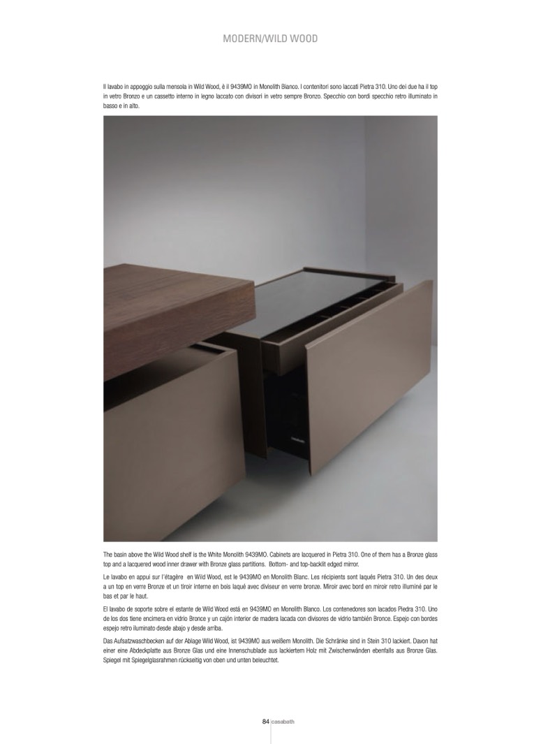 The basin above the Wild Wood shelf is the White Monolith 9439MO. Cabinets are lacquered in Pietra 310. One of them has a Bronze glass