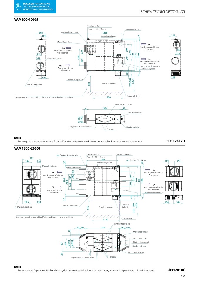 1. Per consentire l'ispezione dei filtri dell'aria, degli scambiatori di calore e dei ventilatori, assicurarsi di prevedere il foro di ispezione.