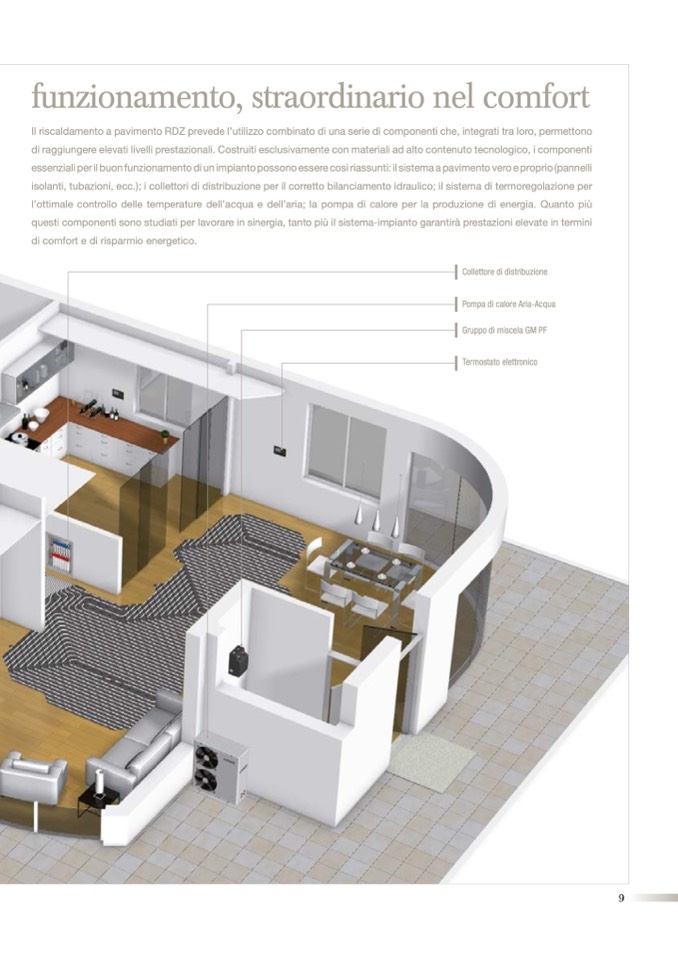 Il riscaldamento a pavimento RDZ prevede l’utilizzo combinato di una serie di componenti che, integrati tra loro, permettono