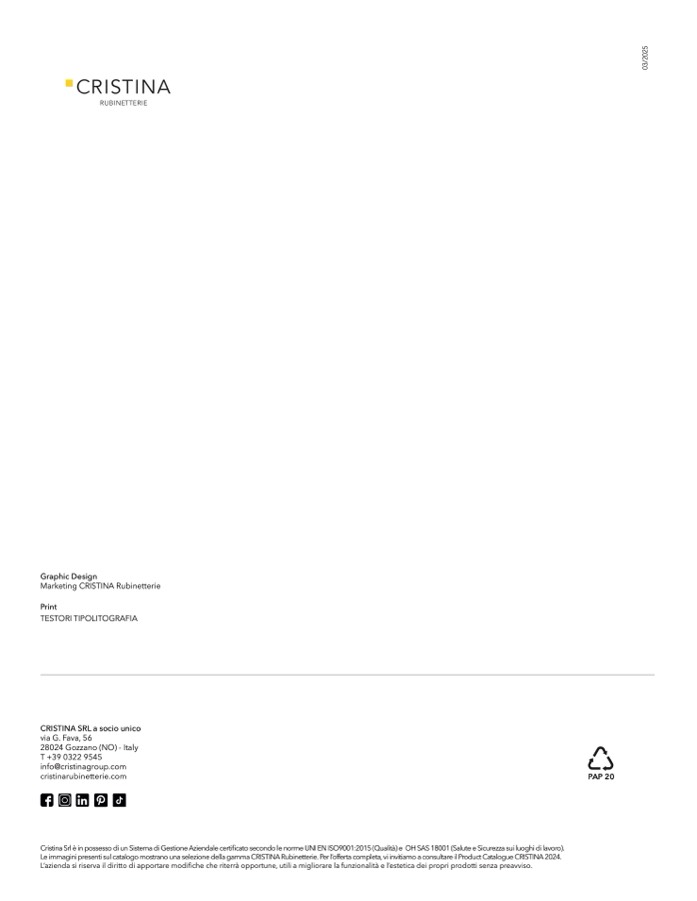 Le immagini presenti sul catalogo mostrano una selezione della gamma CRISTINA Rubinetterie. Per l’offerta completa, vi invitiamo a consultare il Product Catalogue CRISTINA 2024.