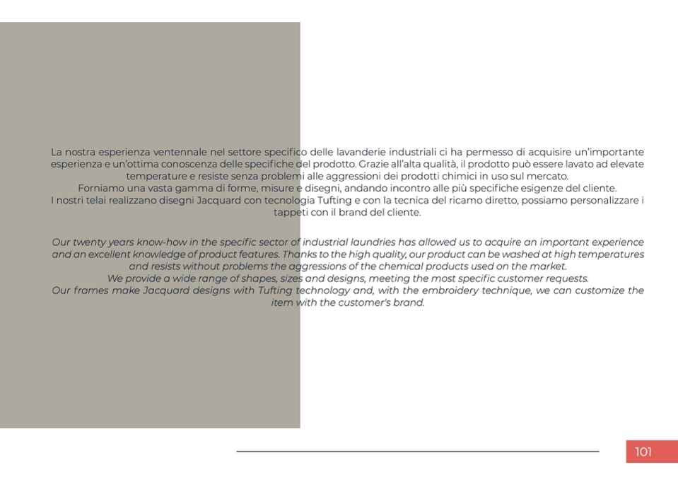 esperienza e un’ottima conoscenza delle specifiche del prodotto. Grazie all’alta qualità, il prodotto può essere lavato ad elevate