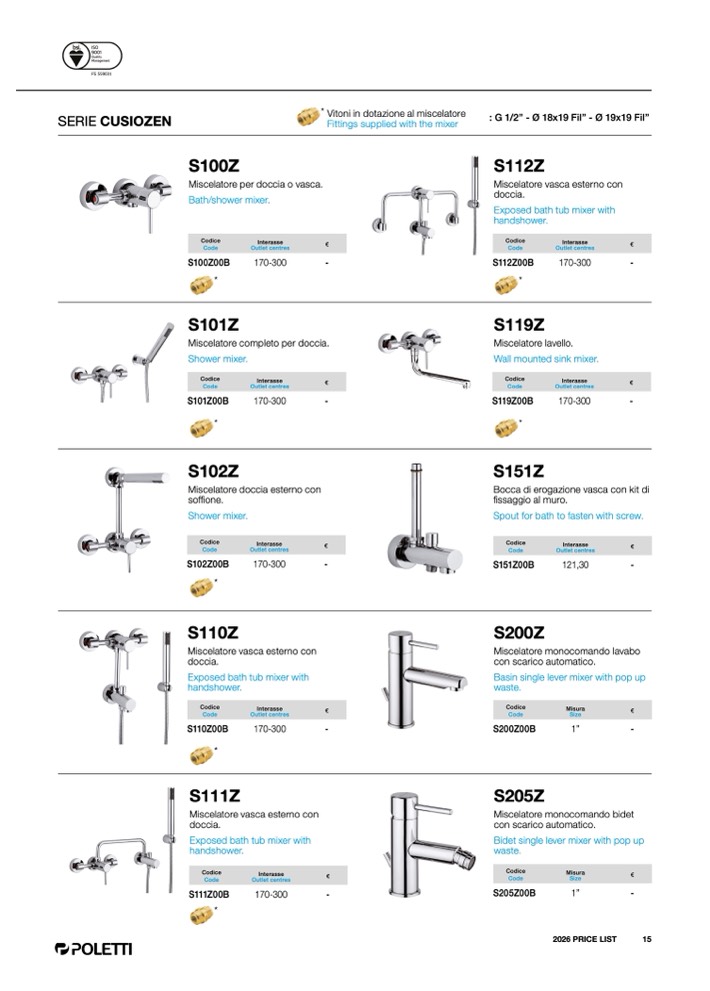Fittings supplied with the mixer