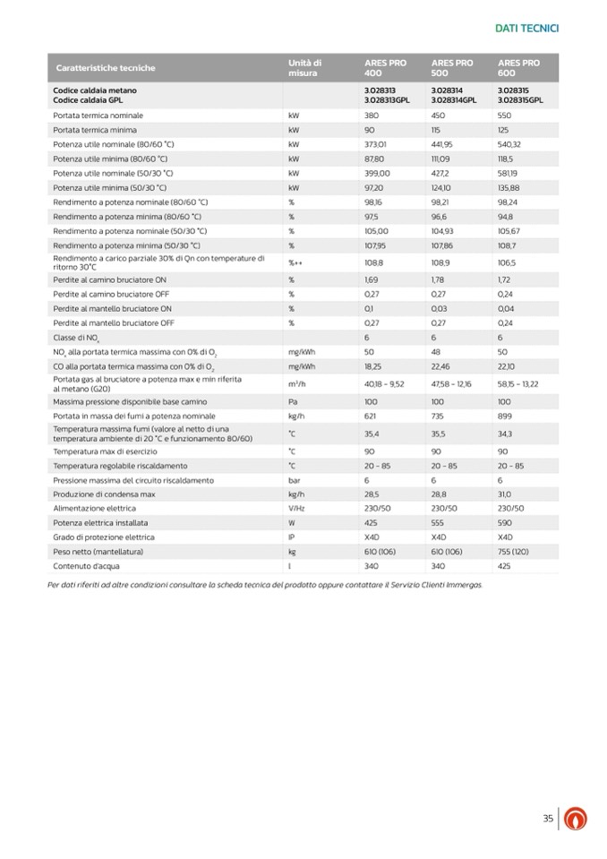 Per dati riferiti ad altre condizioni consultare la scheda tecnica del prodotto oppure contattare il Servizio Clienti Immergas.