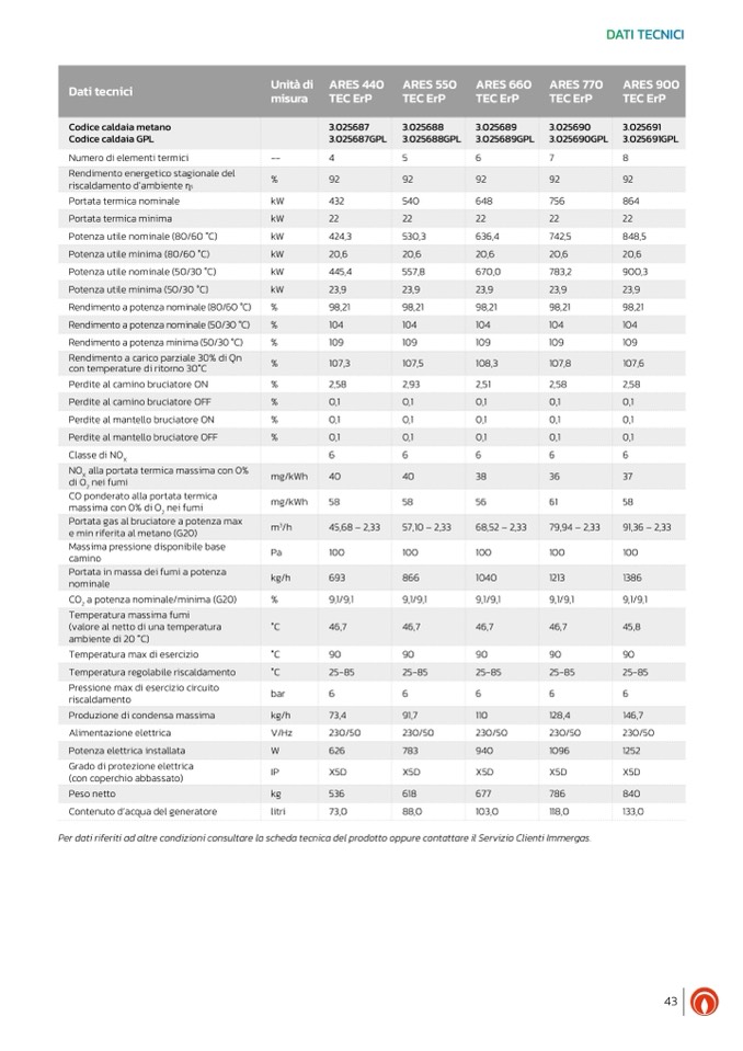 Per dati riferiti ad altre condizioni consultare la scheda tecnica del prodotto oppure contattare il Servizio Clienti Immergas.