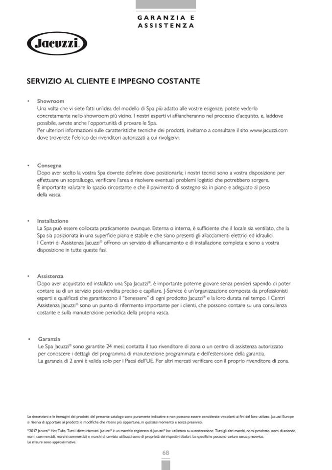 Le descrizioni e le immagini dei prodotti del presente catalogo sono puramente indicative e non possono essere considerate vincolanti ai fini del loro utilizzo. Jacuzzi Europe