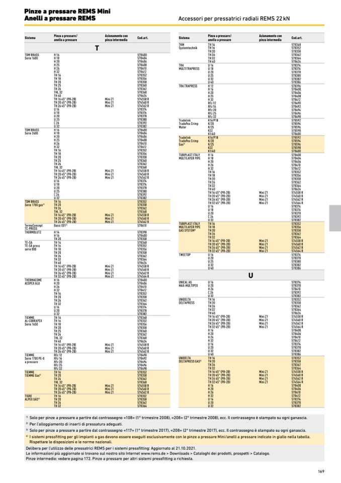 I sistemi pressfitting per gli impianti a gas devono essere eseguiti esclusivamente con le pinze a pressare Mini/anelli a pressare indicate in giallo nella tabella.
