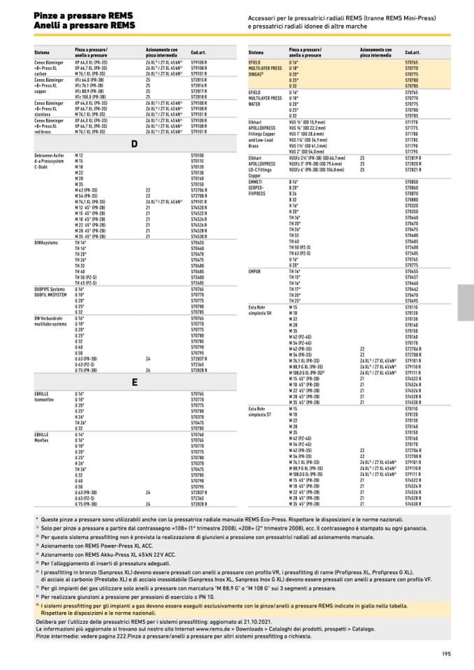 I sistemi pressfitting per gli impianti a gas devono essere eseguiti esclusivamente con le pinze/anelli a pressare REMS indicate in giallo nella tabella.