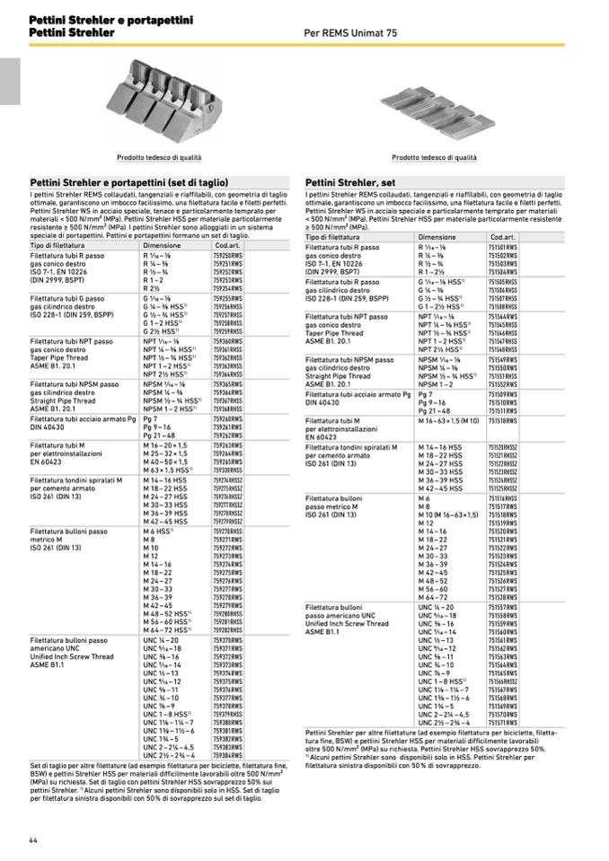 (MPa) su richiesta. Set di taglio con pettini Strehler HSS sovrapprezzo 50% sui
