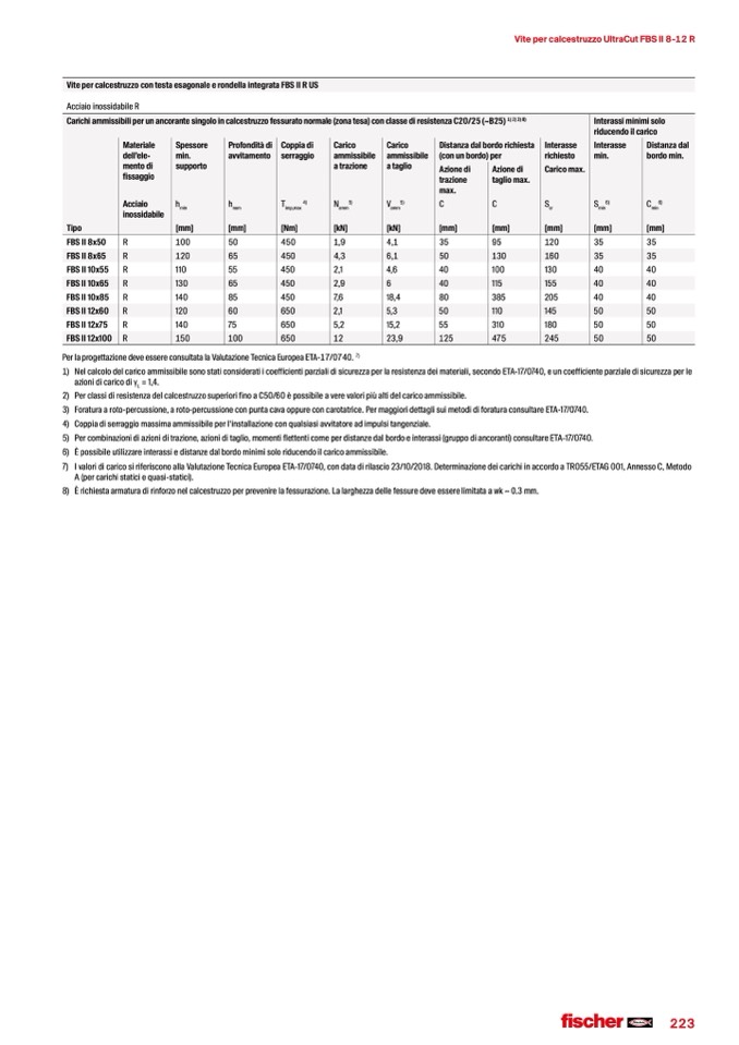 7) I valori di carico si riferiscono alla Valutazione Tecnica Europea ETA-17/0740, con data di rilascio 23/10/2018. Determinazione dei carichi in accordo a TR055/ETAG 001, Annesso C, Metodo