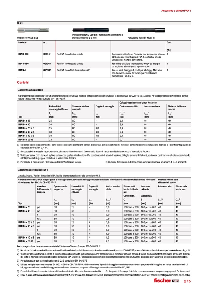 7) IvaloridicaricosiriferisconoallaValutazioneTecnicaEuropeETA-06/0175,condatadirilascio02/03/2021.DeterminazionedeicarichiinaccordoaEN1992-4:2018eCEN/TR17079:2018(percarichistaticiequasi-statici).