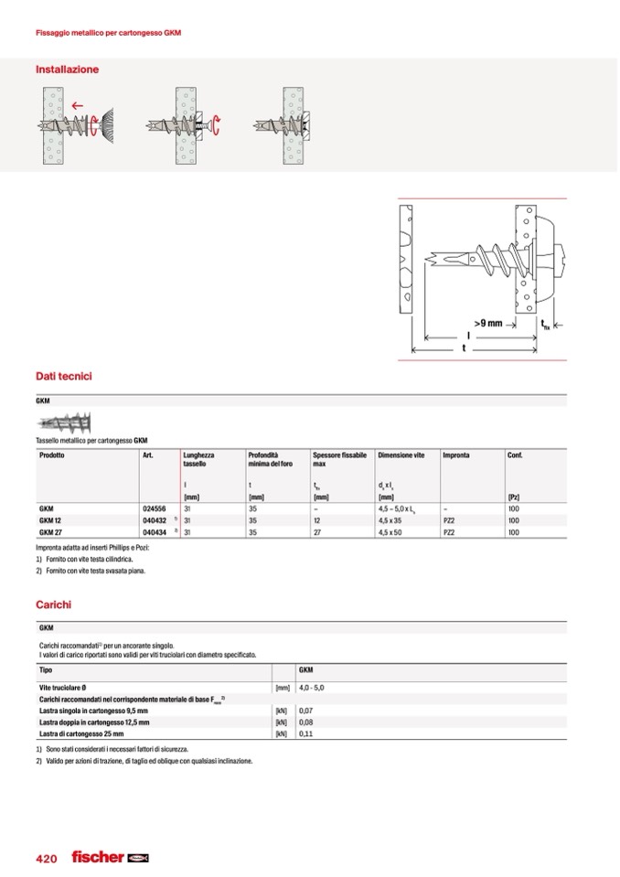 I valori di carico riportati sono validi per viti truciolari con diametro specificato.