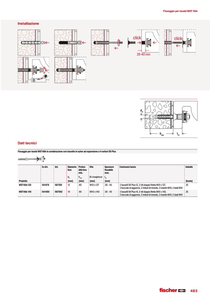 Fissaggio per lavabi WST Klik in combinazione con tassello in nylon ad espansione a 4 settori SX Plus
