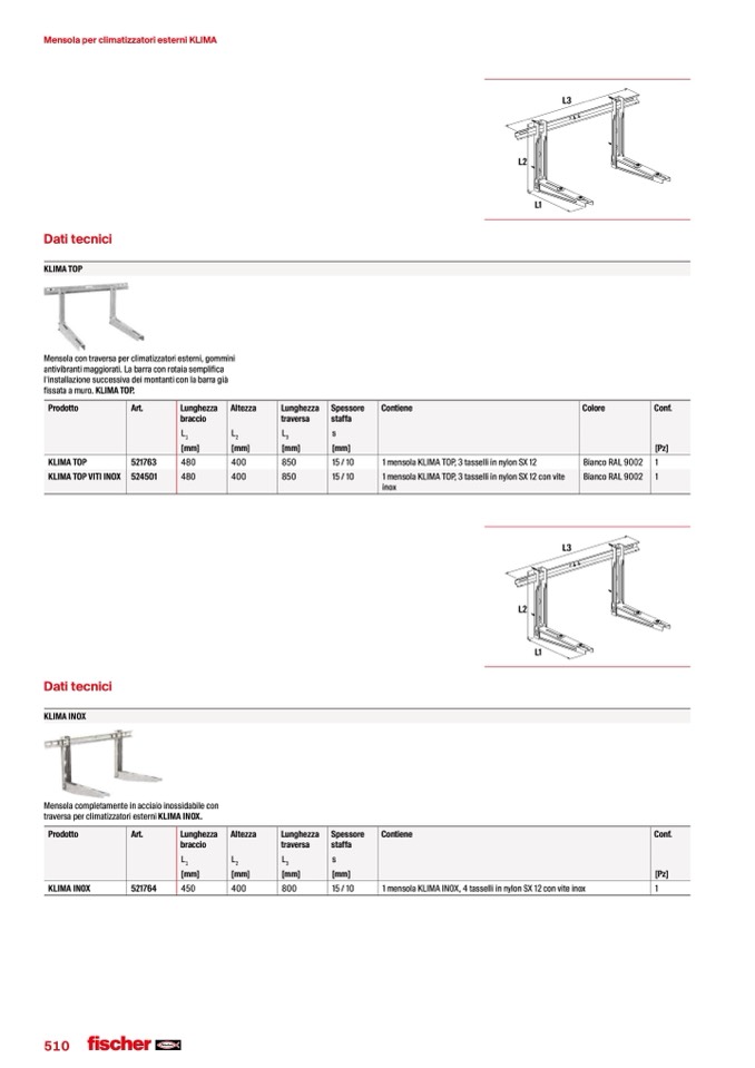 1 mensola KLIMA TOP, 3 tasselli in nylon SX 12 con vite