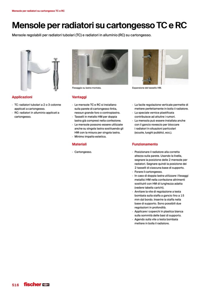 Mensole regolabili per radiatori tubolari (TC) e radiatori in alluminio (RC) su cartongesso.