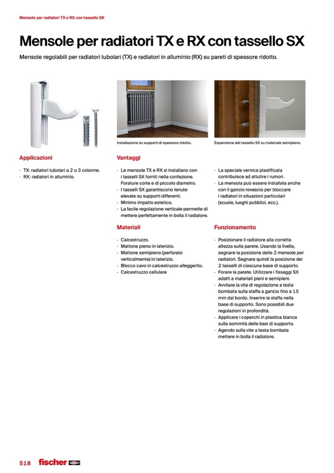 Mensole regolabili per radiatori tubolari (TX) e radiatori in alluminio (RX) su pareti di spessore ridotto.