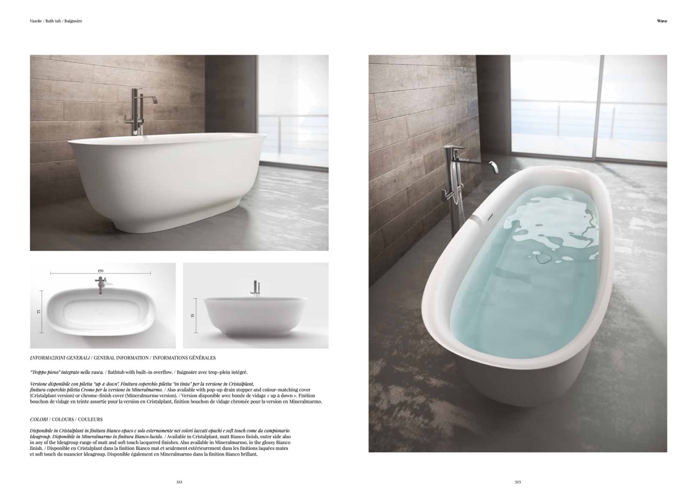 “Troppo pieno” integrato nella vasca. / Bathtub with built-in overflow. / Baignoire avec trop-plein intégré.