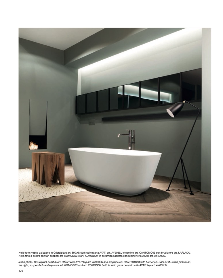 Nelle foto: vasca da bagno in Cristalplant art. BAÌAS con rubinetteria AYATI art. AY903LU e camino art. CANTOMC63 con bruciatore art. LAFLACA.