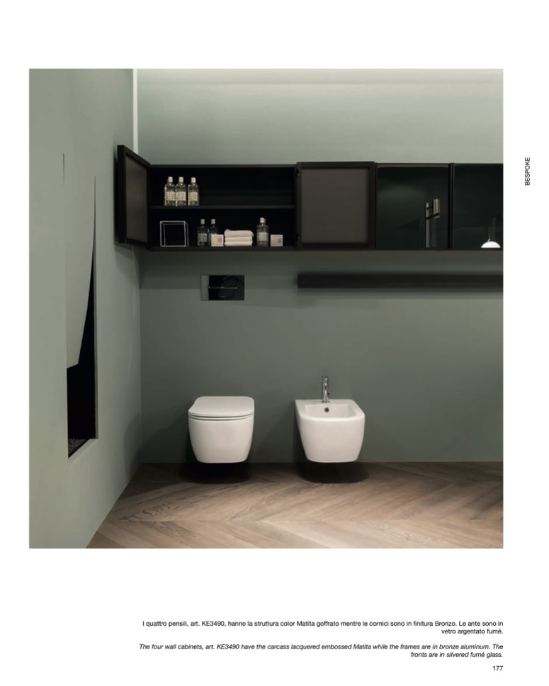 The four wall cabinets, art. KE3490 have the carcass lacquered embossed Matita while the frames are in bronze aluminum. The