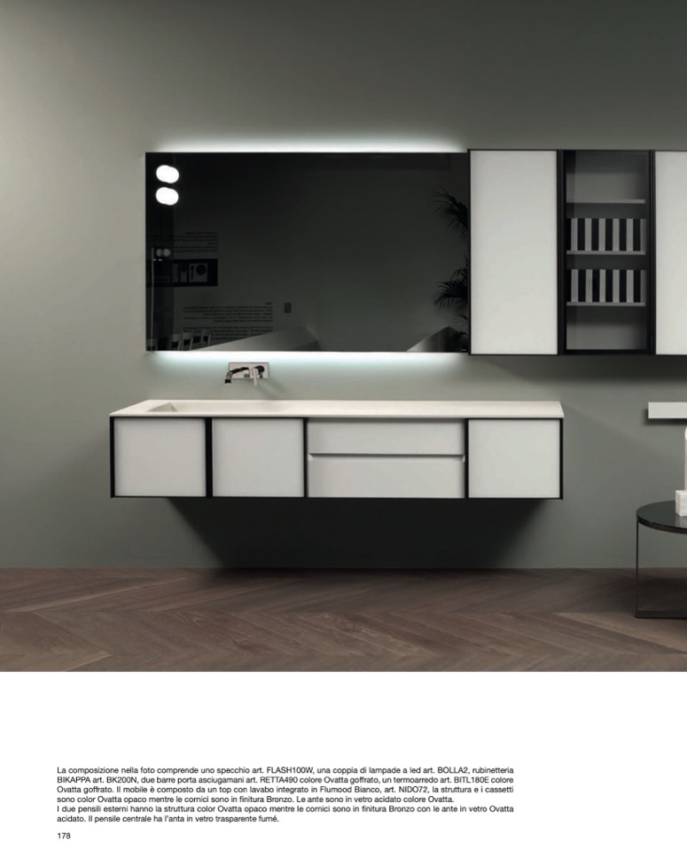 La composizione nella foto comprende uno specchio art. FLASH100W, una coppia di lampade a led art. BOLLA2, rubinetteria