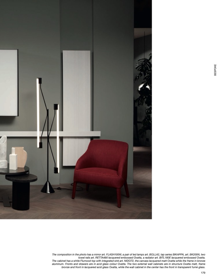 The cabinet has a white Flumood top with integrated sink art. NIDO72, the carcass lacquered matt Ovatta while the frame in bronze