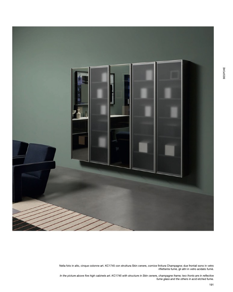 In the picture above five high cabinets art. KC1745 with structure in Skin cenere, champagne frame; two fronts are in reflective