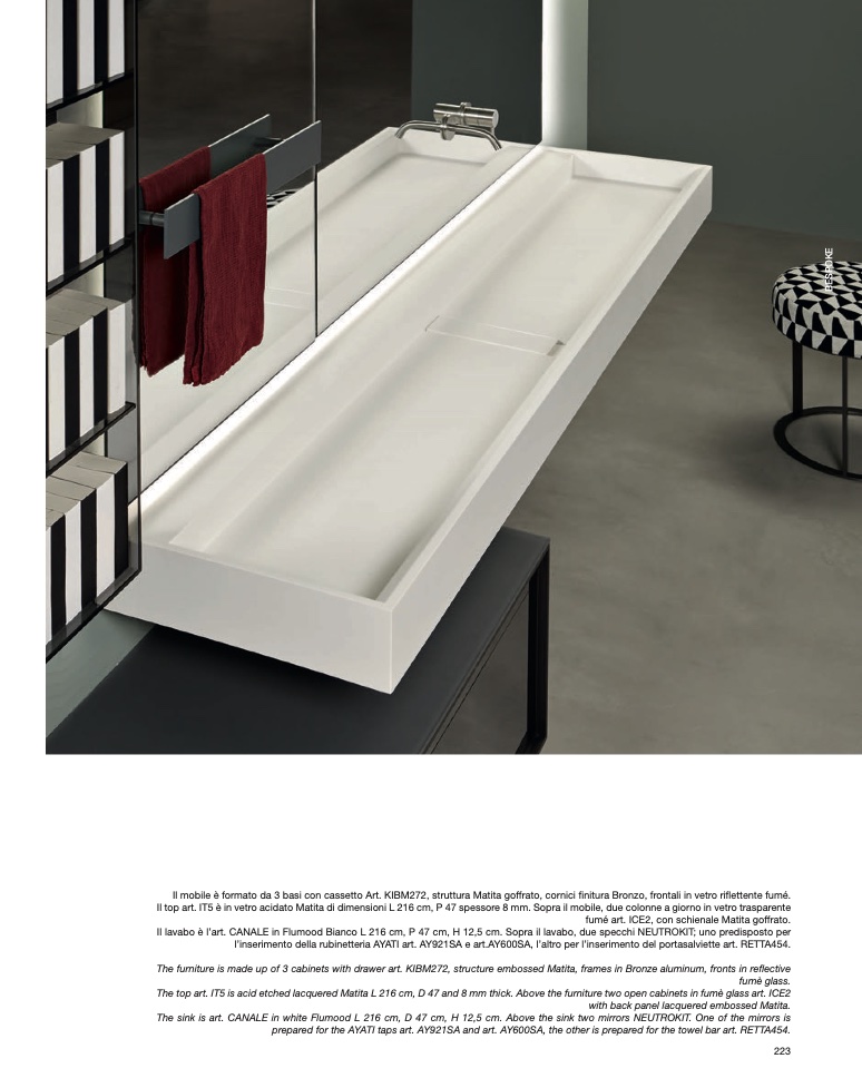 The sink is art. CANALE in white Flumood L 216 cm, D 47 cm, H 12,5 cm. Above the sink two mirrors NEUTROKIT. One of the mirrors is