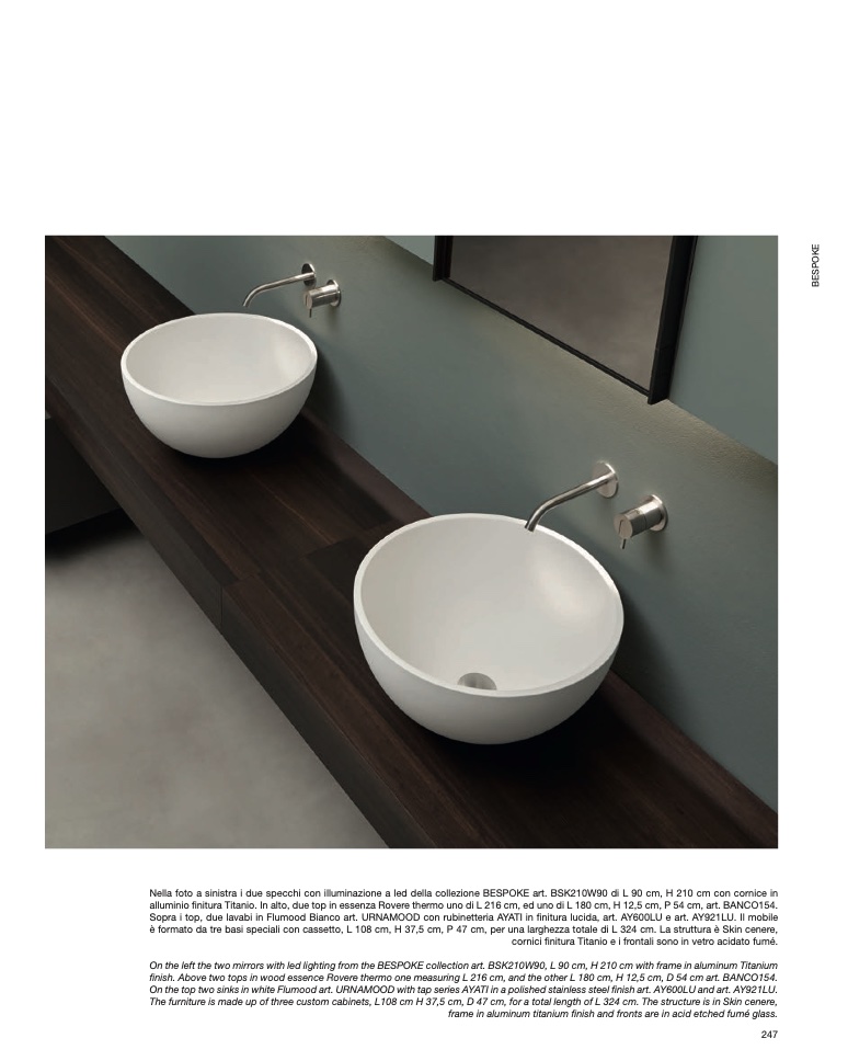 Sopra i top, due lavabi in Flumood Bianco art. URNAMOOD con rubinetteria AYATI in finitura lucida, art. AY600LU e art. AY921LU. Il mobile