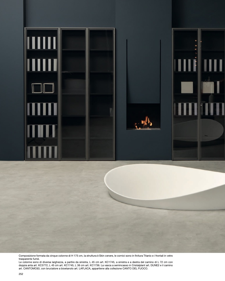 doppia anta art. KC3772, L 45 cm art. KC1745, L 36 cm art. KC1736. La vasca a semincasso in Cristalplant art. DUNE2 e il camino
