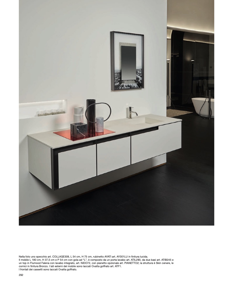 Il mobile L 180 cm, H 37,5 cm e P 54 cm con gola ad “L”, è composto da un porta lavabo art. ATIL290, da due basi art. ATIB245 e