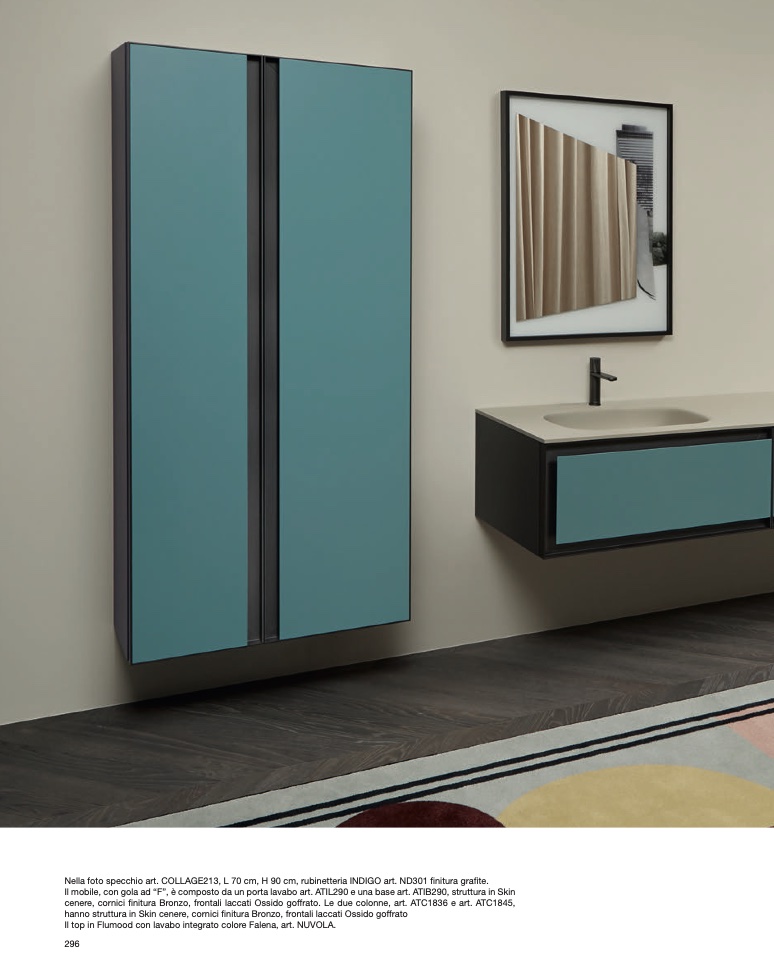 Il mobile, con gola ad “F”, è composto da un porta lavabo art. ATIL290 e una base art. ATIB290, struttura in Skin
