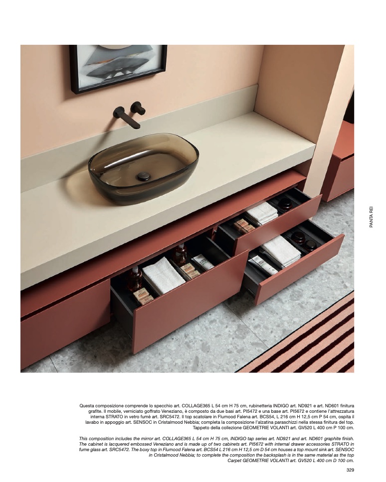 fume glass art. SRC5472. The boxy top in Flumood Falena art. BCS54 L 216 cm H 12,5 cm D 54 cm houses a top mount sink art. SENSOC