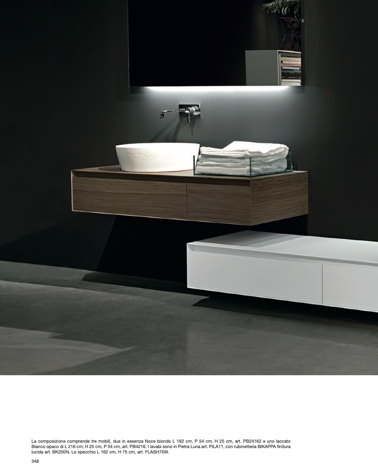 Bianco opaco di L 216 cm, H 25 cm, P 54 cm, art. PB4216. I lavabi sono in Pietra Luna art. PILA11, con rubinetteria BIKAPPA finitura