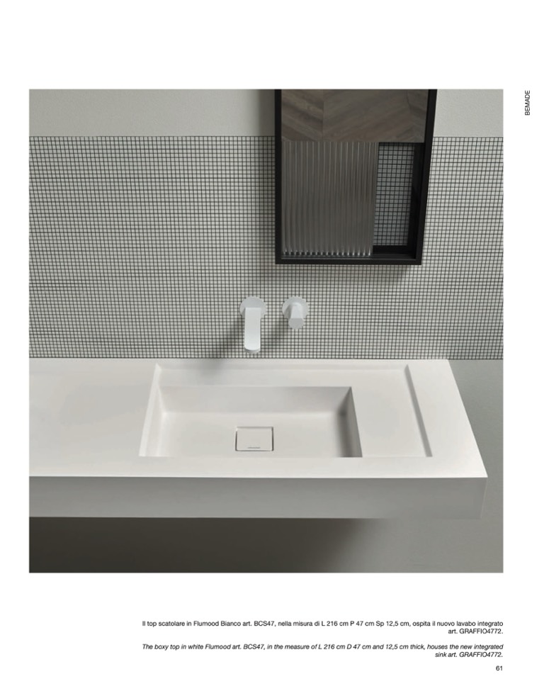 Il top scatolare in Flumood Bianco art. BCS47, nella misura di L 216 cm P 47 cm Sp 12,5 cm, ospita il nuovo lavabo integrato