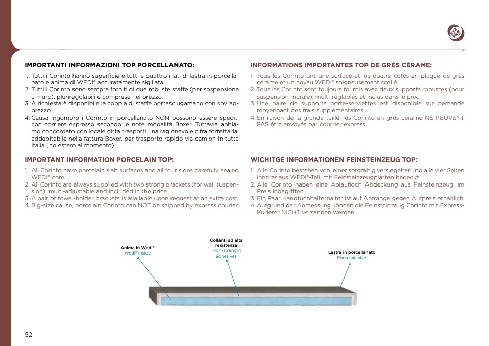 1. All Corinto have porcelain slab surfaces and all four sides carefully sealed