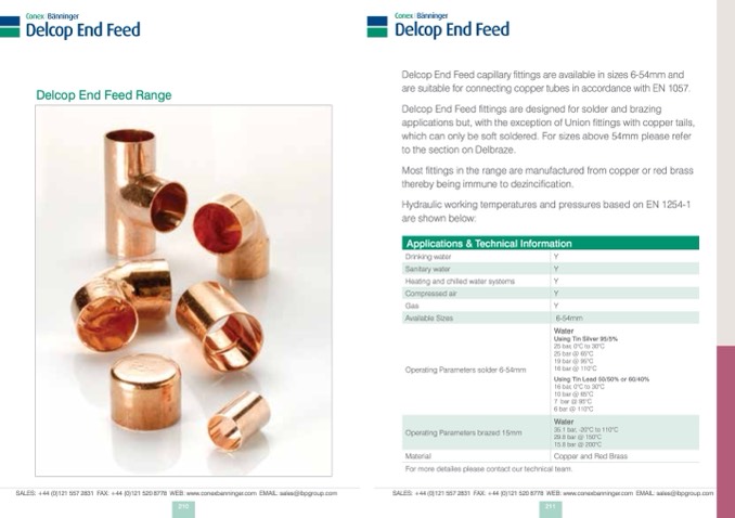 Delcop End Feed fittings are designed for solder and brazing