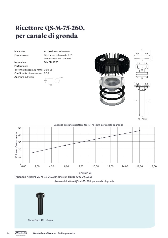 Capacità di scarico ricettore QS-M-75-260, per canale di gronda