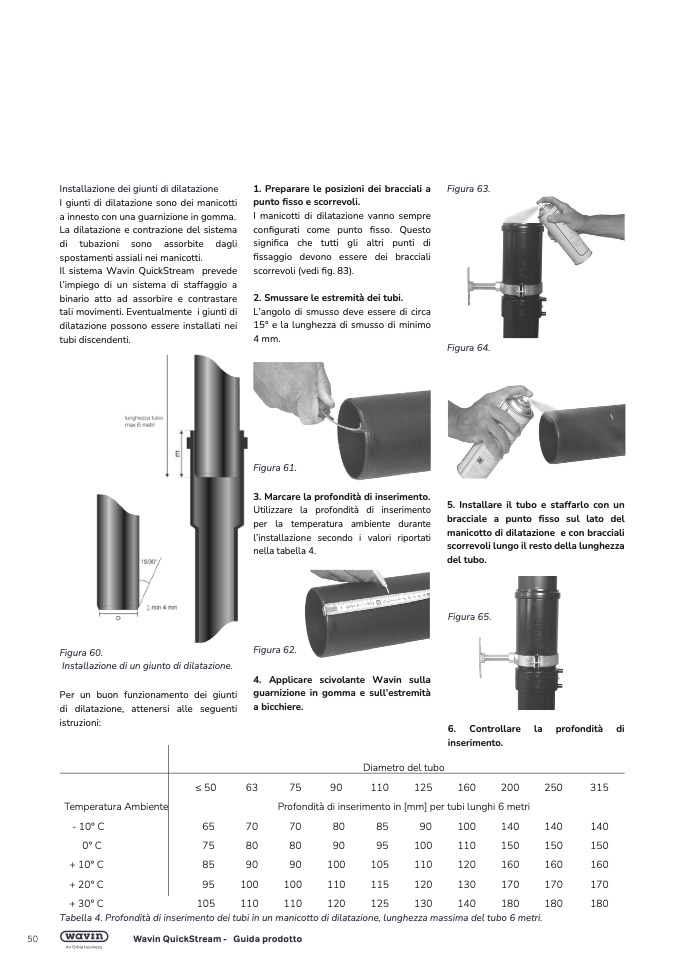 Tabella 4. Profondità di inserimento dei tubi in un manicotto di dilatazione, lunghezza massima del tubo 6 metri.