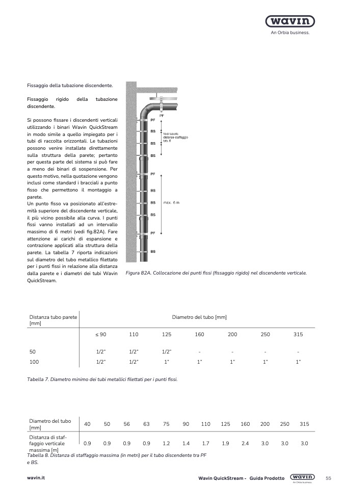 Tabella 8. Distanza di staffaggio massima (in metri) per il tubo discendente tra P