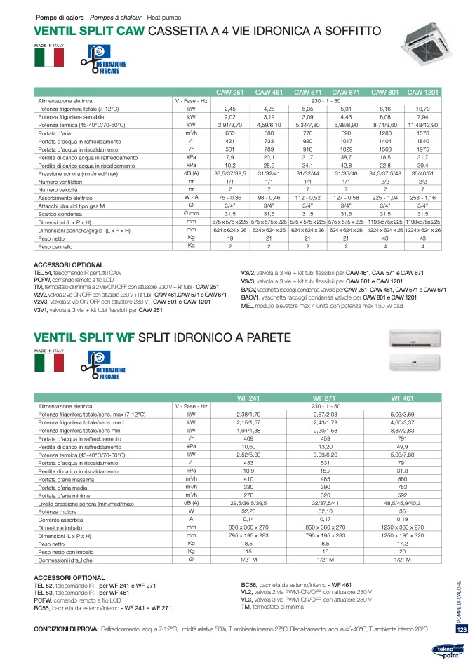 CONDIZIONIDIPROVA: Raffreddamento:acqua7-12°C,umiditàrelativa50%,T.ambienteinterno27°C.Riscaldamento:acqua45-40°C,T.ambienteinterno20°C