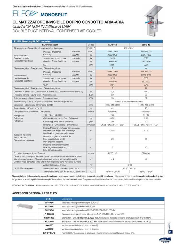 CONDIZIONI DI PROVA: Raffreddamento: Int. 27°C B.S. - Est 35°C B.S. / 24°C B.U. - Riscaldamento: Int. 20°C B.S. - Est 7°C B.S. / 6°C B.U.
