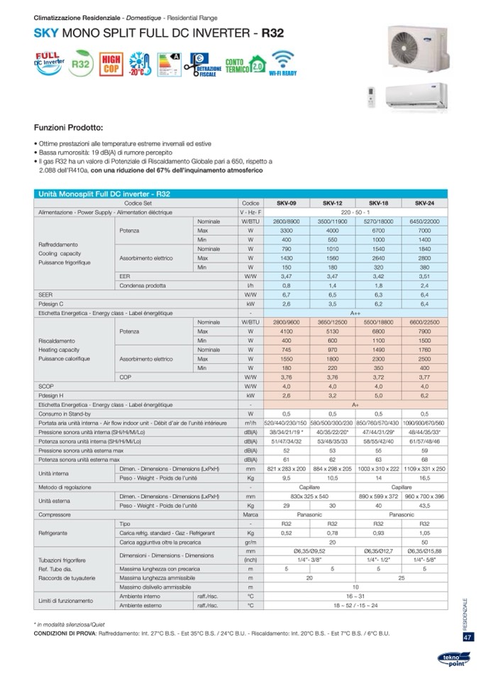 CONDIZIONI DI PROVA: Raffreddamento: Int. 27°C B.S. - Est 35°C B.S. / 24°C B.U. - Riscaldamento: Int. 20°C B.S. - Est 7°C B.S. / 6°C B.U.