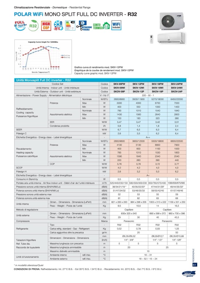 CONDIZIONI DI PROVA: Raffreddamento: Int. 27°C B.S. - Est 35°C B.S. / 24°C B.U. - Riscaldamento: Int. 20°C B.S. - Est 7°C B.S. / 6°C B.U.