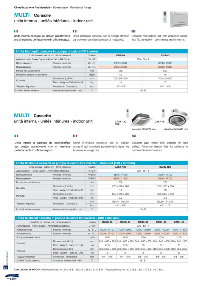 CONDIZIONI DI PROVA: Raffreddamento: Int. 27°C B.S. - Est 35°C B.S. / 24°C B.U. - Riscaldamento: Int. 20°C B.S. - Est 7°C B.S. / 6°C B.U.