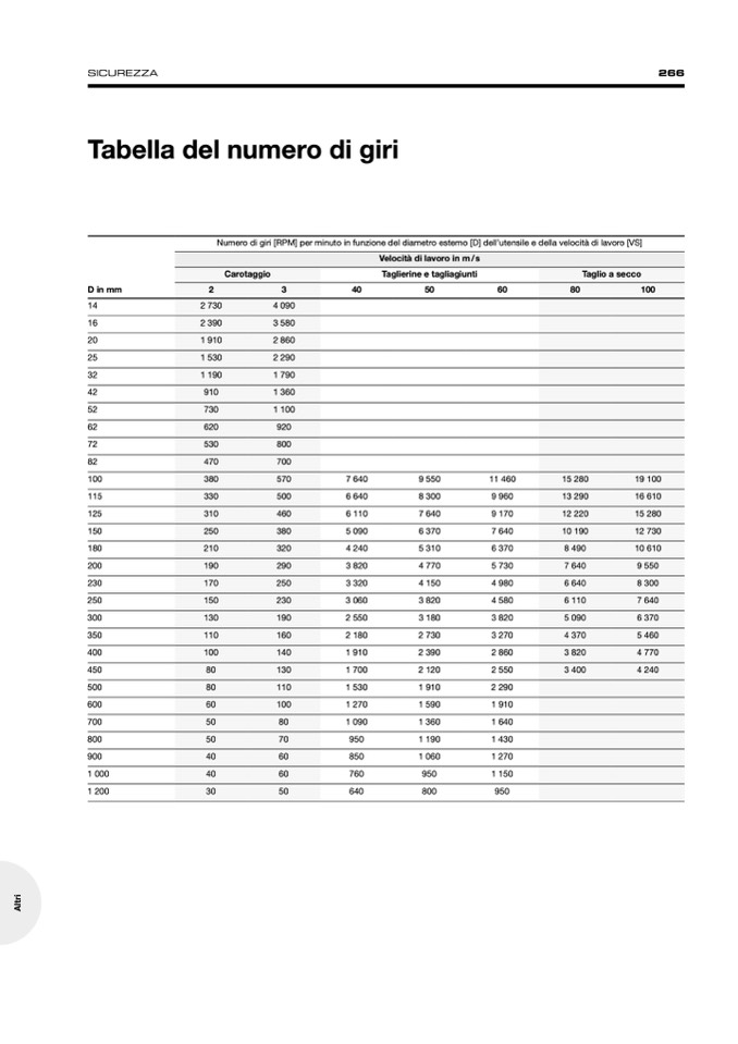 Numero di giri [RPM] per minuto in funzione del diametro esterno [D] dell’utensile e della velocità di lavoro [VS]