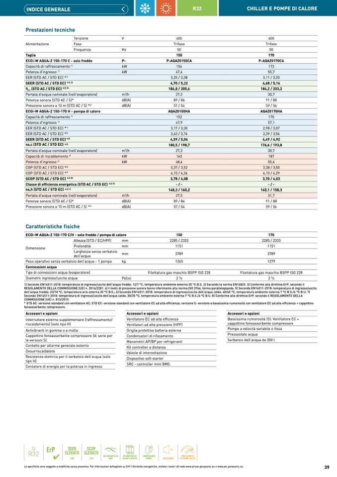 1) Secondo EN14511-2018: temperatura di ingresso/uscita dell'acqua fredda: 12/7 °C, temperatura ambiente esterna 35 °C B.S. 2) Secondo la norma EN14825. 3) Conforme alla direttiva ErP: secondo il