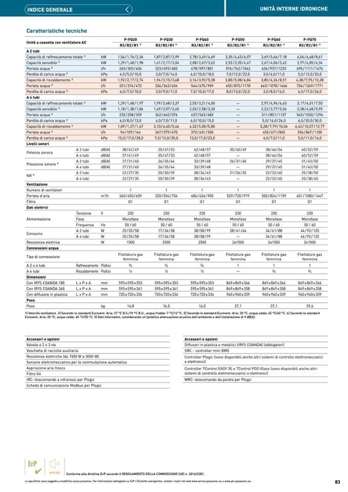 1) Velocità ventilatore. 2) Secondo lo standard Eurovent. Aria: 27 °C B.S./19 °C B.U., acqua fredda: 7 °C/12 °C. 3) Secondo lo standard Eurovent. Aria: 20 °C, acqua calda: 45 °C/40 °C. 4) Secondo lo standard